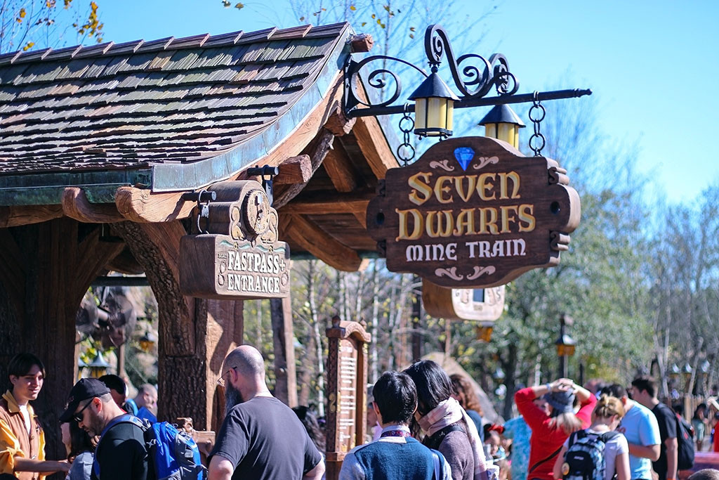 A Seven Dwarfs Mine Train fica na parte nova da Fantasyland, e tem altura mínima de 97 cm.